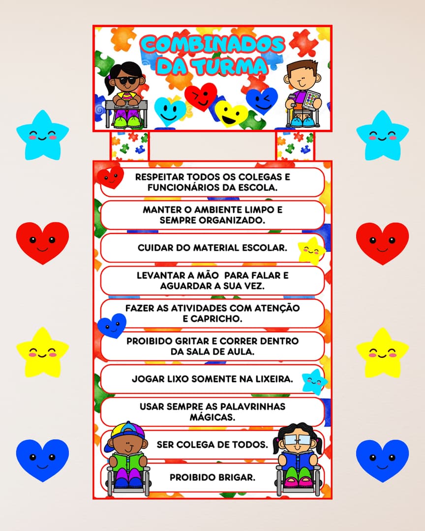 COMBINADOS DA TURMA - EDUCAÇÃO ESPECIAL 🥰✨ O combinados da turma é um material muito importante para ter dentro da sala de aula, pois é a partir dele que o professor vai incentivar seus alunos a manter a boa educação no ambiente escolar, seguindo as regrinhas de boa convivência. ✅ O arquivo é composto por: - 19 páginas; - Banner ampliado; - Dez tópicos com os combinados; - Oito imagens para enfeitar.