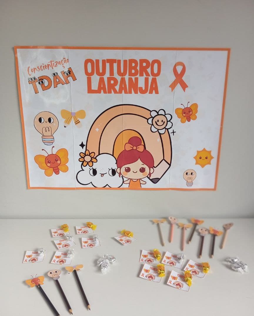 Painel Outubro Laranja com cartãozinho e ponteira para lápis. Material fofo e educativo sobre TDAH, ideal para decorar a escola e promover conscientização com empatia. PDF pronto para imprimir!