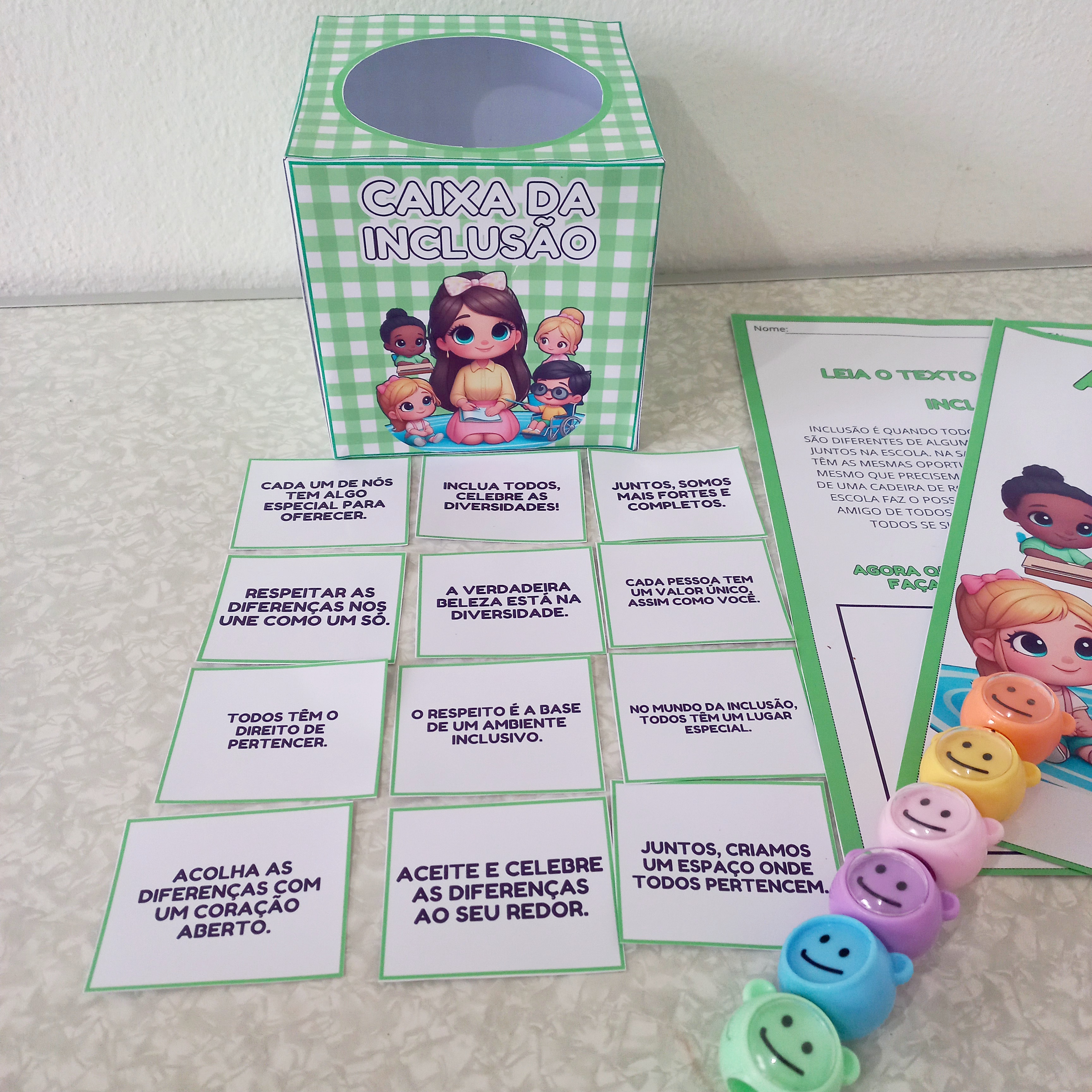 🖨️ O material vai em PDF pronto para impressão, e inclui os seguintes itens: 💜Molde para caixa 💚20 fichas com frases incentivando a inclusão 💙Atividade com texto explicativo sobre o que significa inclusão