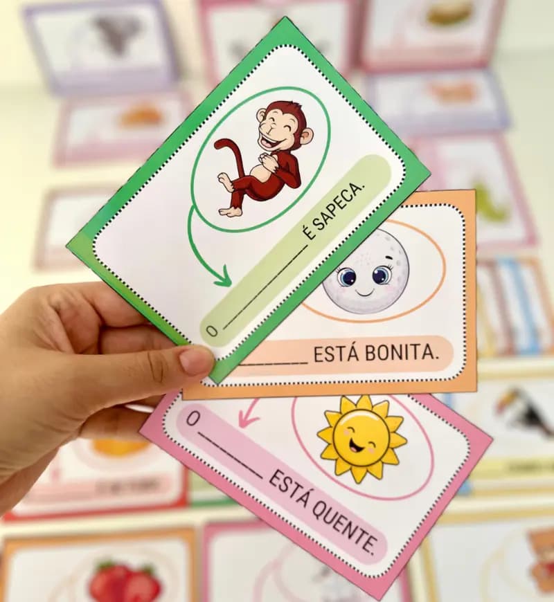 Recurso Complete a Frase para trabalhar leitura de frases e escrita de palavras com crianças em fase de alfabetização.