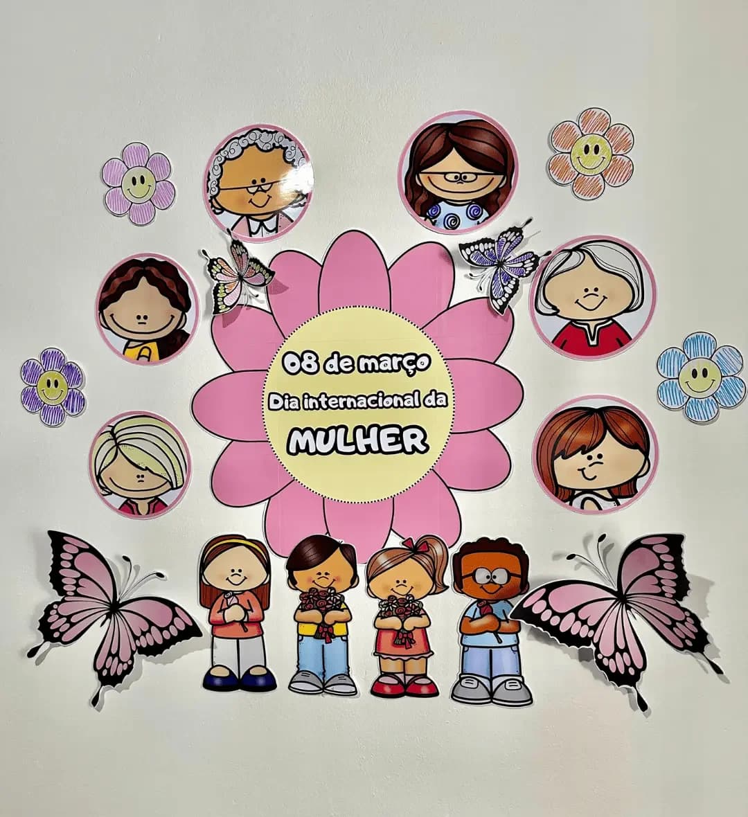 Acompanha flores e borboletas para colorir, para as crianças participarem da construção do painel. Para impressão recomenda-se usar papel de gramatura 180 e cola de silicone líquida. Medidas painel montado: 1,2 m de largura e 90cm de altura
