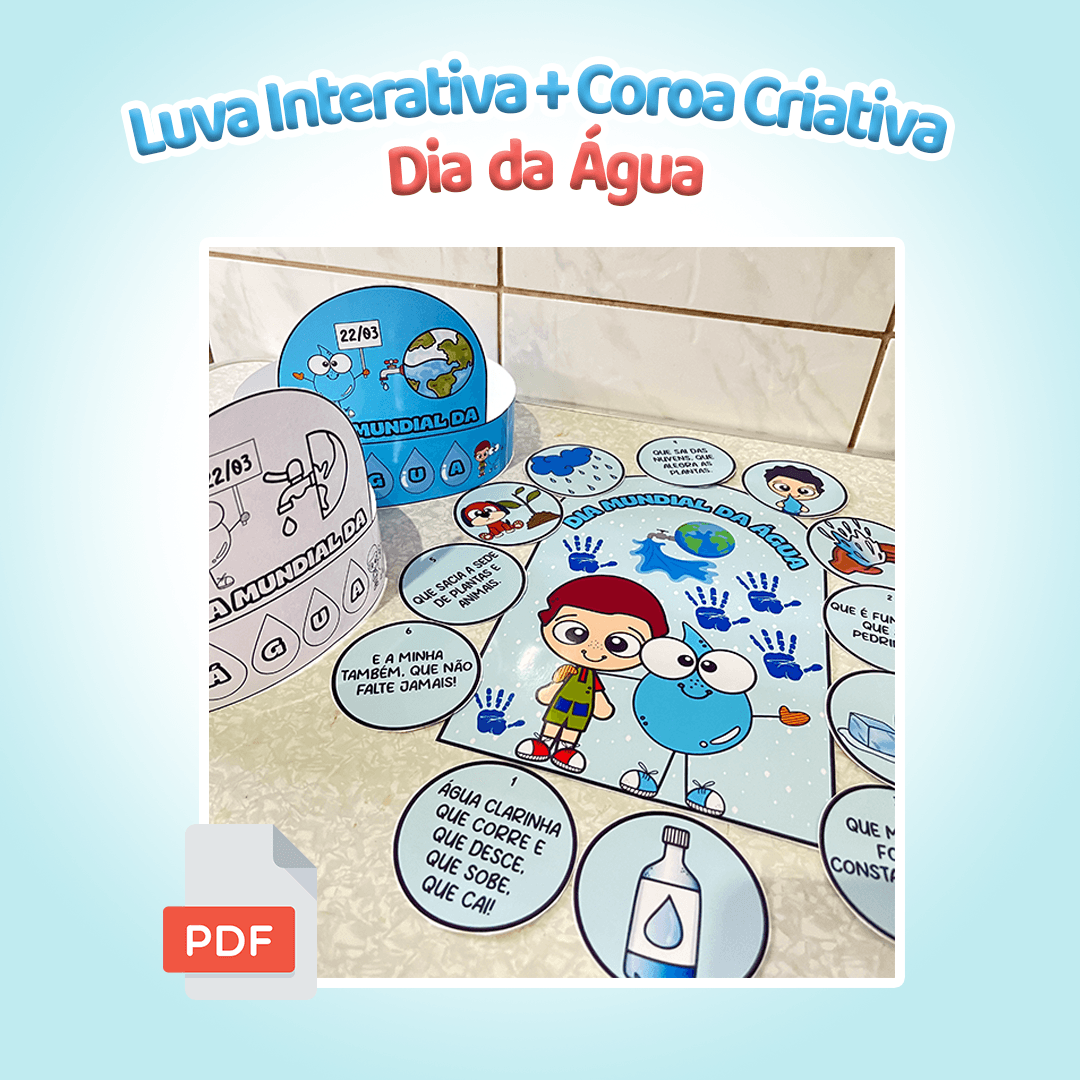 Kit lúdico para trabalhar o Dia da Água com luva interativa e coroa criativa. Ideal para Educação Infantil e Ensino Fundamental. Arquivo em PDF pronto para imprimir.