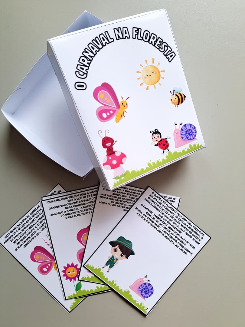 Encante seus alunos com a "História na Caixa: O Carnaval na Floresta"! Recurso em PDF pronto para imprimir, com molde da caixa e história ilustrada sobre amizade e identidade. Perfeito para trabalhar o Carnaval de forma lúdica e pedagógica.