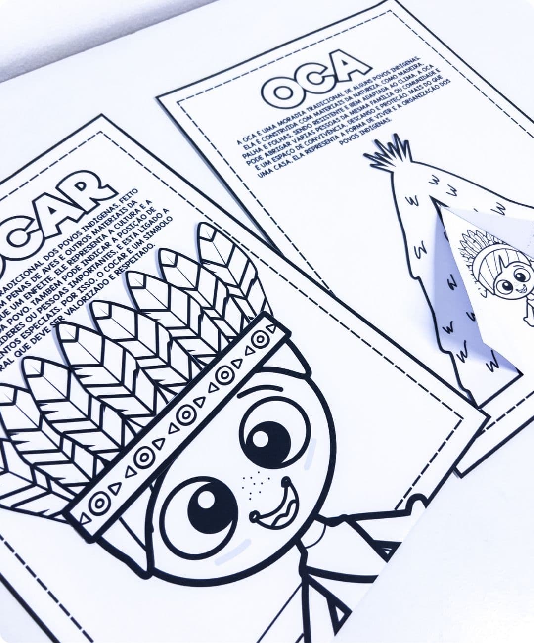 Perfeito para a Educação Infantil e Anos Iniciais (Alfabetização), o kit foca em dois símbolos fundamentais: a Oca e o Cocar, permitindo que o aluno aprenda fazendo.
