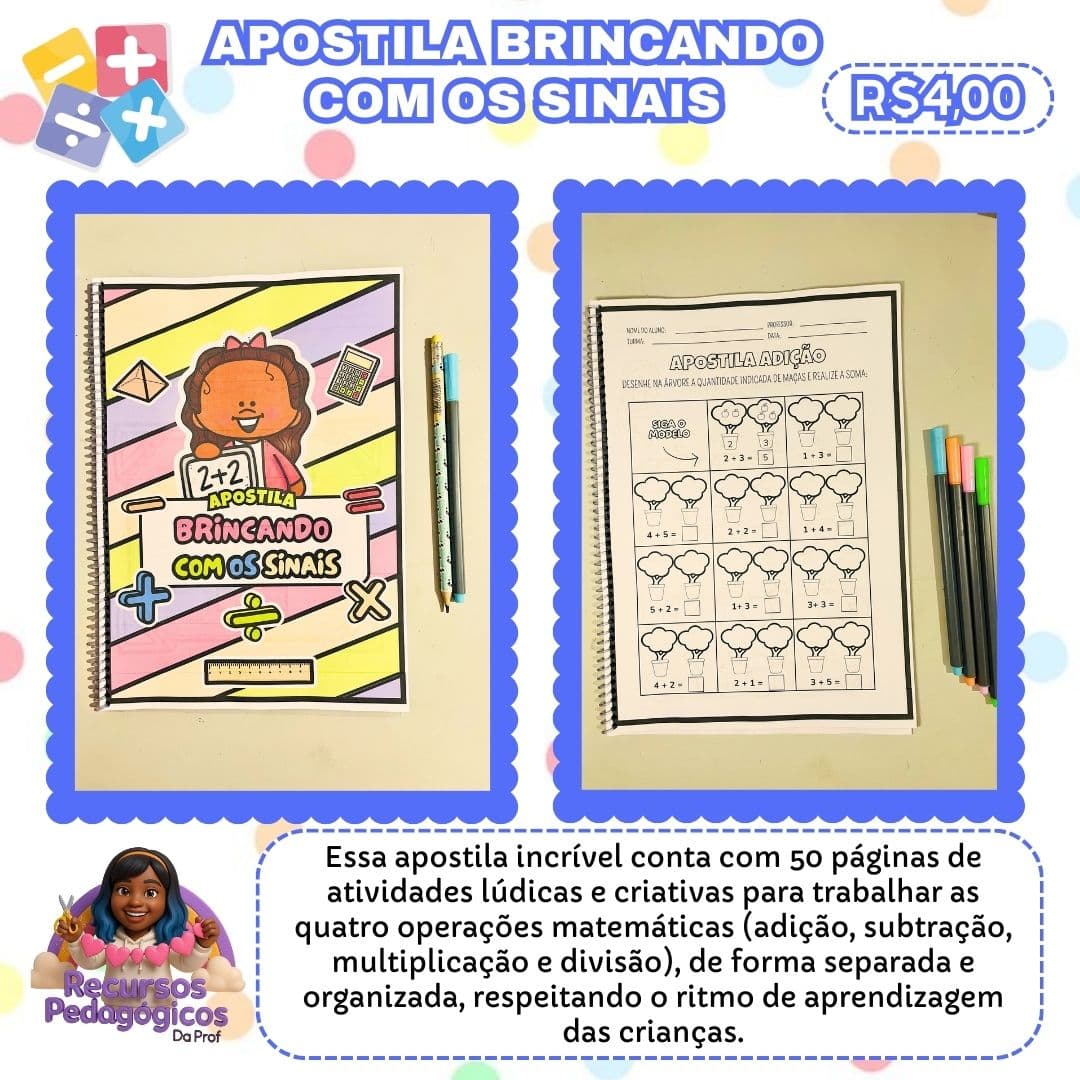 Essa apostila incrível conta com 50 páginas de atividades lúdicas e criativas para trabalhar as quatro operações matemáticas (adição, subtração, multiplicação e divisão), de forma separada e organizada, respeitando o ritmo de aprendizagem das crianças.