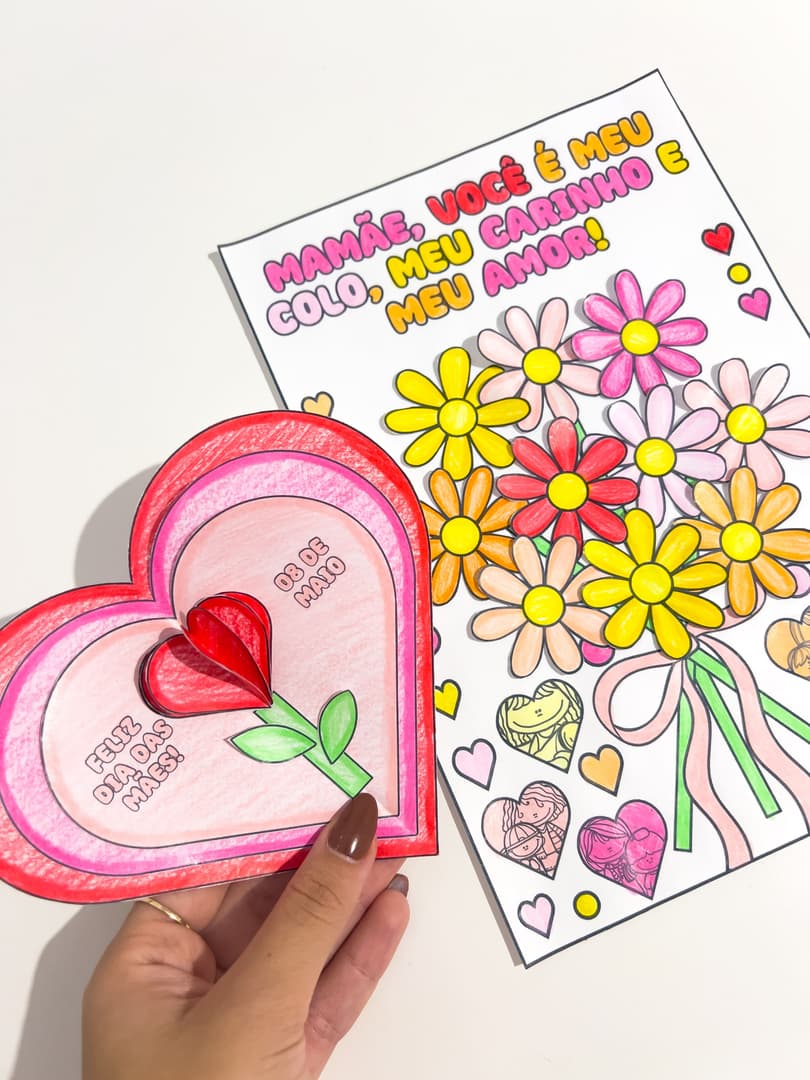 Cartões para Colorir Dia das Mães Cartões de Dia das Mães para colorir, feitos especialmente para as crianças demonstrarem carinho de forma criativa. Com desenhos simples e mensagens fofas, são perfeitos para colorir e presentear com amor! São duas opções, uma composta por uma folha outra por duas folhas.