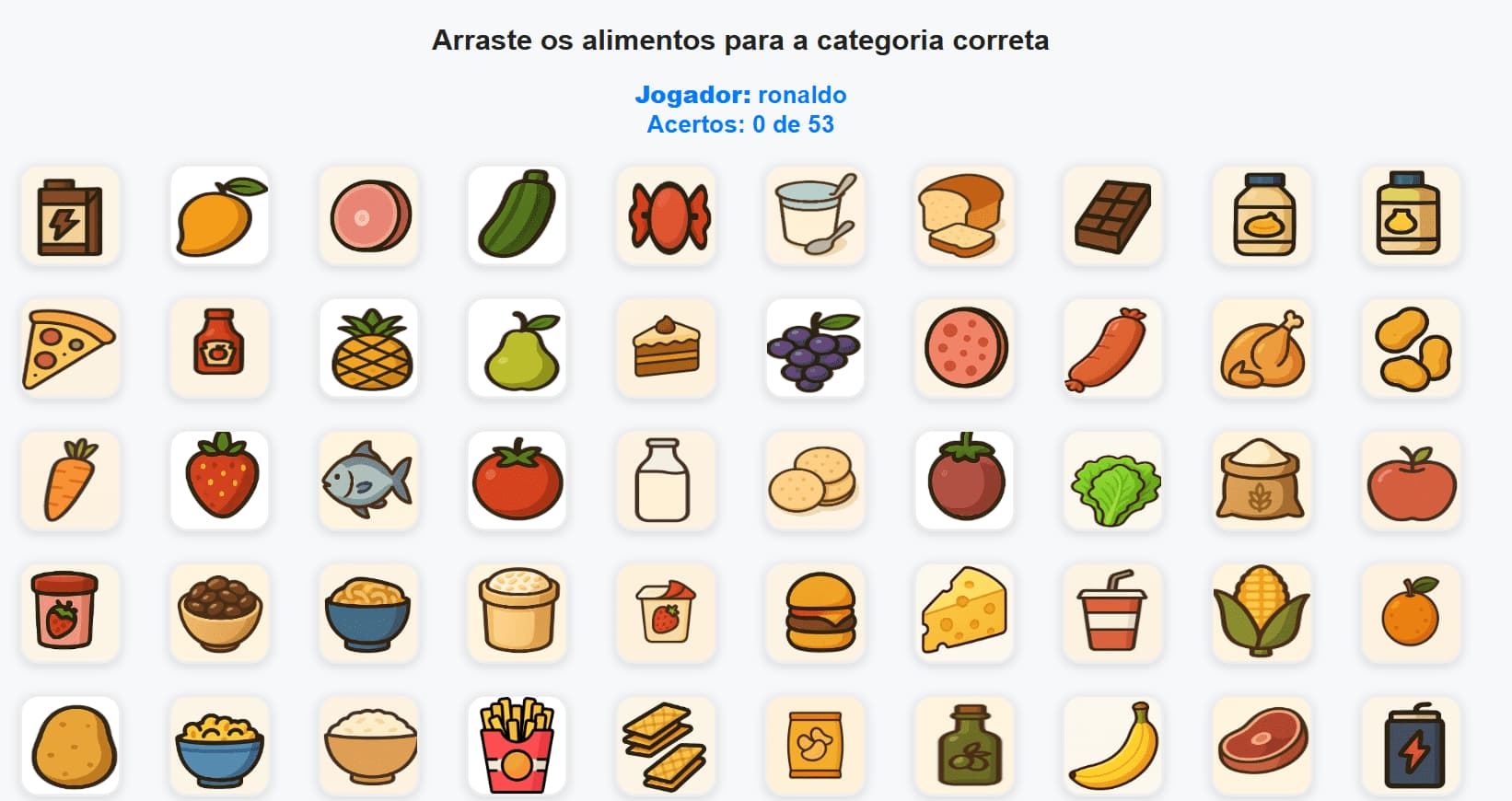 Jogo online para classificar 53 alimentos em categorias corretas, promovendo aprendizagem lúdica sobre nutrição.