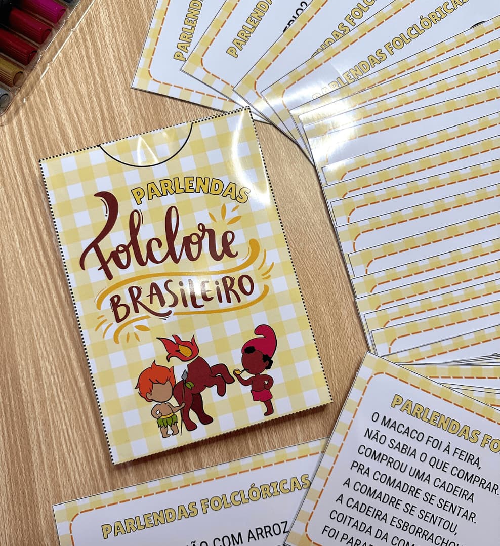 O arquivo Parlendas Folclóricas inclui 34 parlendas folclóricas e uma caixinha para guardar o material. Entre os benefícios que o uso de parlendas oferece para a educação infantil e anos iniciais do ensino fundamental, é possível destacar: Desenvolvimento da fala Treino de leitura Memória Rimas Aprimoramento da linguagem corporal Ampliação das formas de expressão
