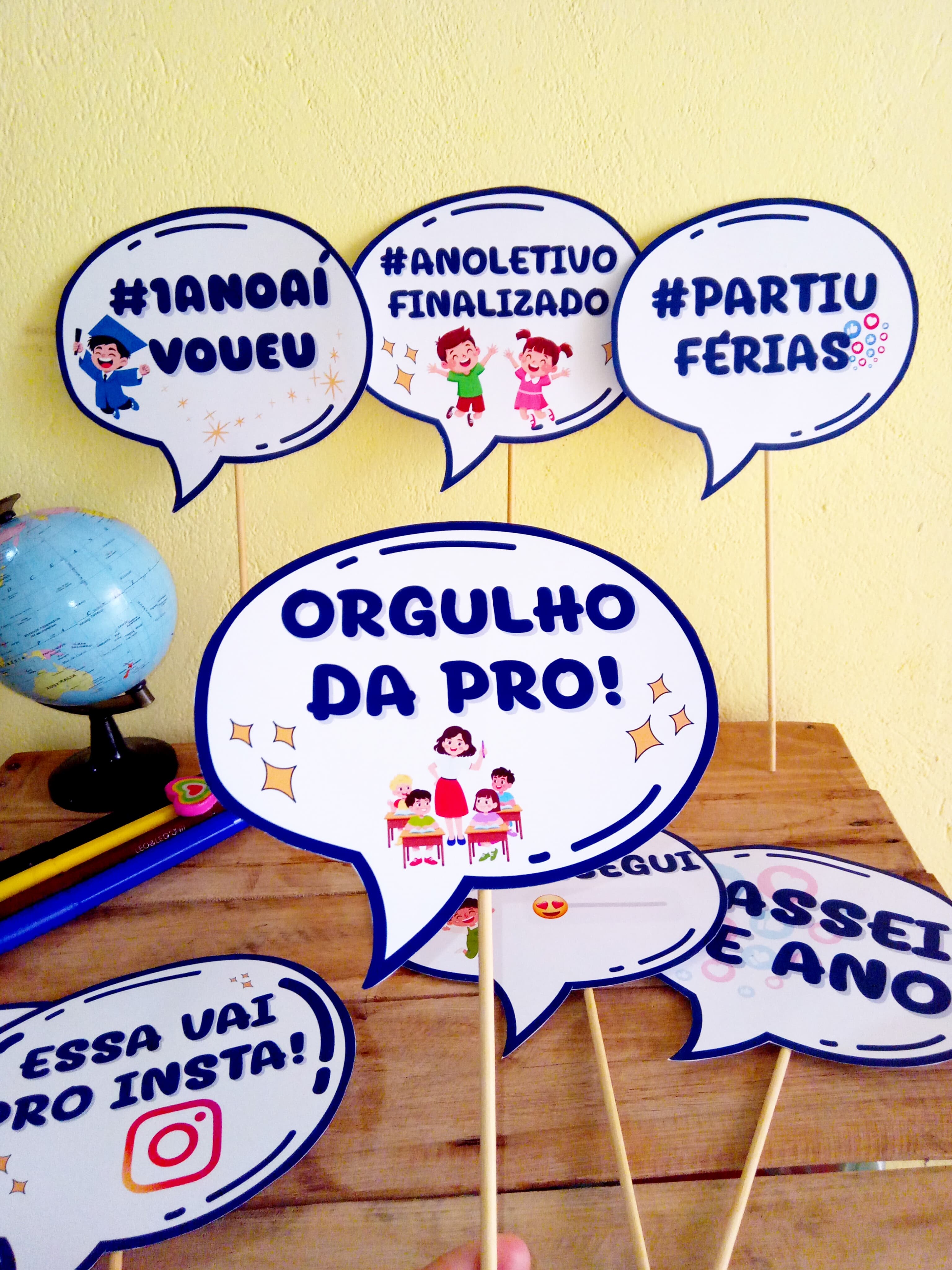 Um conjunto com 8 plaquinhas divertidas em formato de balão de fala para fotos de final de ano.