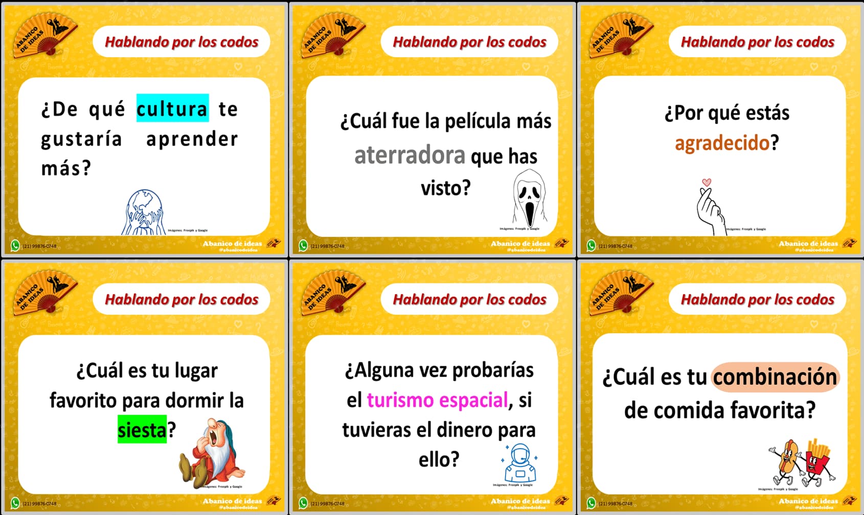 Hablando por los codos es un juego oral divertido y dinámico que anima a los estudiantes a hablar sin parar (¡o casi!) sobre diferentes temas. A través de tarjetas con palabras clave, imágenes o preguntas, los participantes deben improvisar un pequeño discurso, contar una historia o simplemente expresar su opinión durante un tiempo determinado. Contiene 24 tarjetas