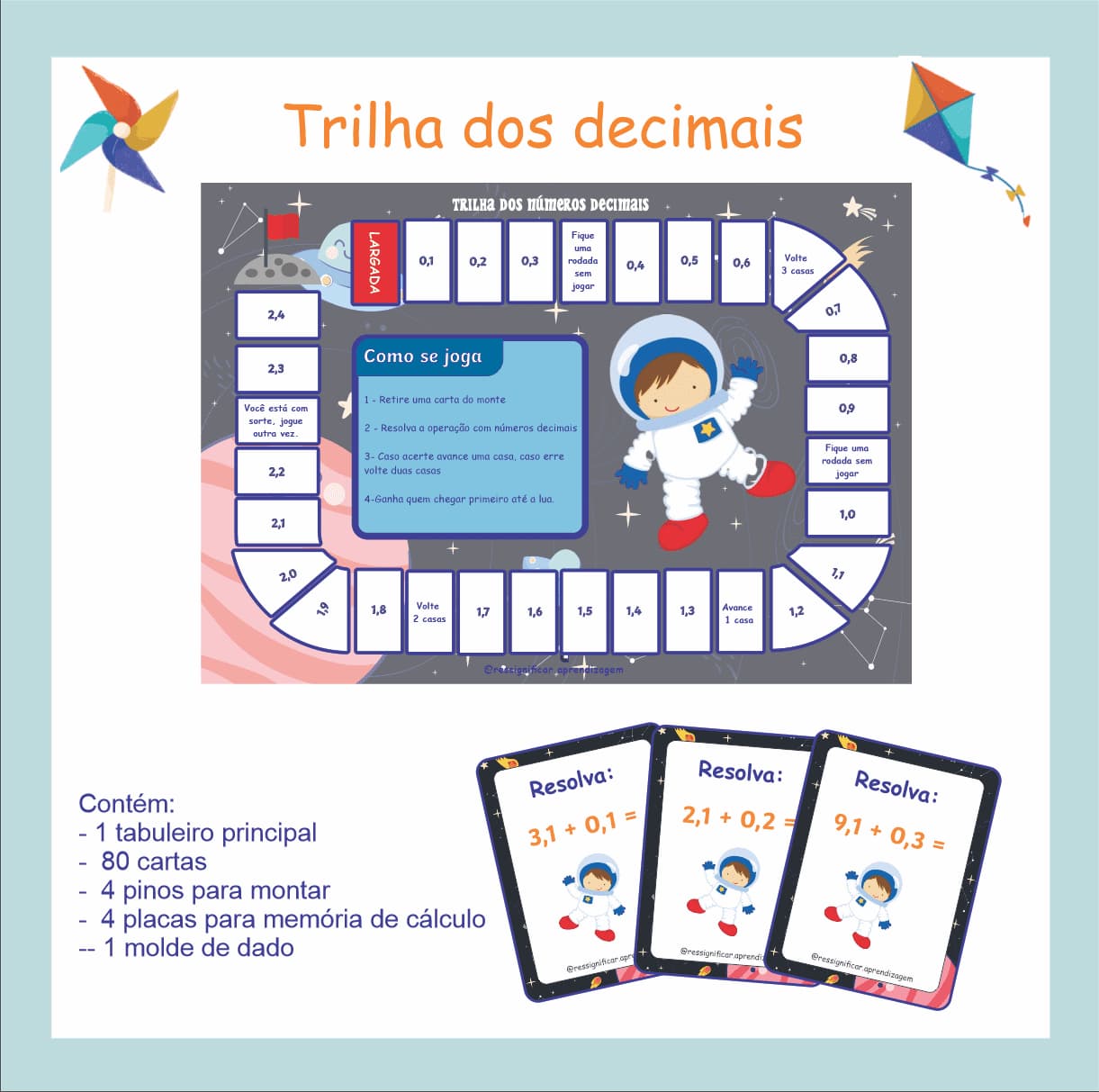 A Trilha dos Decimais é um jogo educativo e divertido que transforma o aprendizado dos números decimais em uma verdadeira aventura! Ao jogar o dado e seguir as instruções das cartas, as crianças praticam as operações com decimais de forma lúdica e engajadora. O arquivo é composto por: 1 tabuleiro principal 80 cartas 4 pinos para montar 4 placas para memória de calculo 1 dado para montar