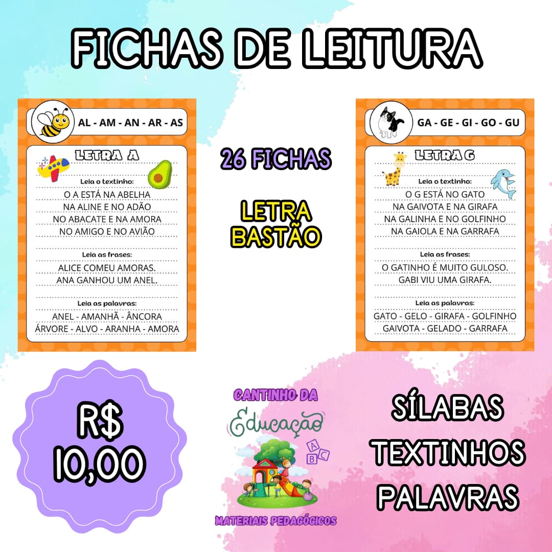 CONTÉM: 26 FICHAS SÍLABAS TEXTINHOS FRASES PALAVRAS