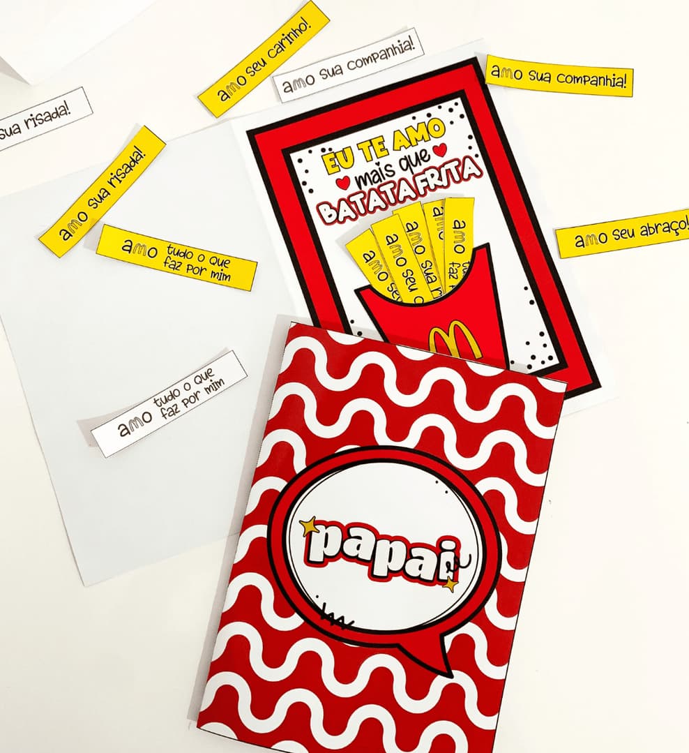 Cartão Dia dos Pais tema Batata Frita. O arquivo vai em PDF pronto para impressão, nas opções colorido e para colorir. Cartão interativo lindo e de fácil montagem, que vai com vídeo tutorial de com o passo a passo. Para impressão recomendamos papel de gramatura 120 ou superior.