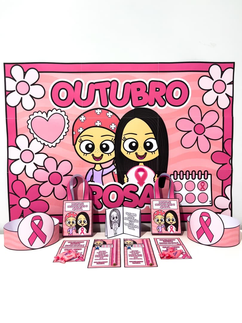 O Kit Painel e Lembrancinhas Outubro Rosa é um material pedagógico criativo e educativo, desenvolvido para trabalhar a conscientização sobre a importância da prevenção e do diagnóstico precoce do câncer de mama. O kit é composto por: 🌸 Painel decorativo colorido e ilustrado, com personagens infantis que transmitem acolhimento e esperança, perfeito para ambientar salas de aula, murais ou eventos escolares. 👑 Coroas temáticas com o laço rosa, símbolo oficial da campanha. 🎁 Sacolinhas lembrancinhas ilustradas com personagens e frases motivacionais. ✏️ Marcadores de página com lápis que reforçam a mensagem de cuidado e prevenção. 🍬 Cartão com doces como gesto de carinho e incentivo à participação. 📖 Mini livreto/atividade para colorir com informações e desenhos, unindo aprendizado e interação lúdica. 📚 Sugestão de uso em sala de aula: este kit pode ser utilizado em atividades temáticas durante o mês de outubro, promovendo rodas de conversa, dinâmicas e produções artísticas. Além de decorar o ambiente escolar, o material estimula reflexões sobre autocuidado, empatia e conscientização social, integrando valores importantes ao processo educativo.