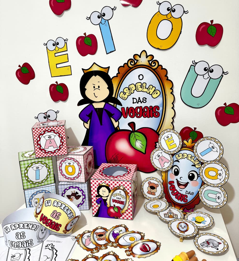 Kit O Espelho das Vogais para trabalhar o conteúdo com crianças da Educação Infantil. O material vai em PDF pronto para impressão. Não editável. O material inclui: Painel ampliado Caixinhas das vogais Caixa com fichas para pareamento Luva com a História “O Espelho das Vogais” Atividade pinte o espelho das Vogais Livrinho opção colorida e para colorir Coroa na opção colorida e para colorir