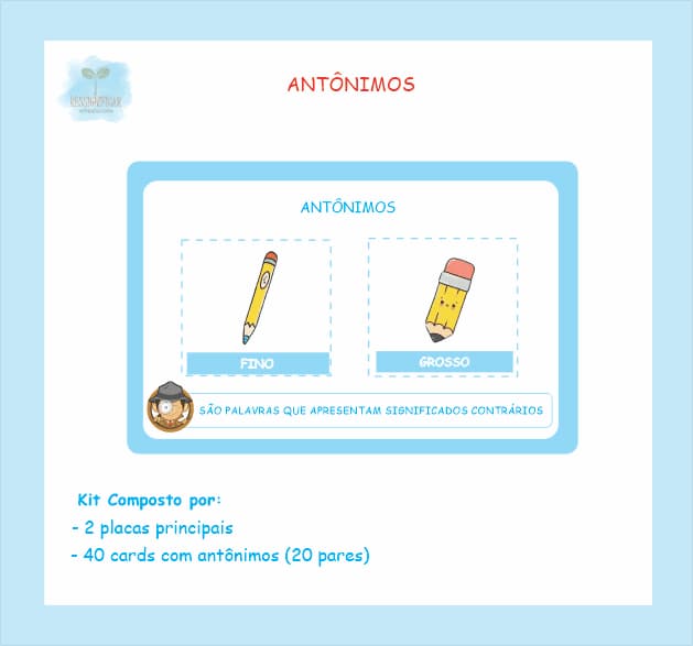 Antônimos é um jogo educativo que convida as crianças a explorarem o mundo dos antônimos de forma divertida e interativa. Através de cartas com palavras e ilustrações, os alunos são desafiados a encontrar os pares de palavras com significados opostos.