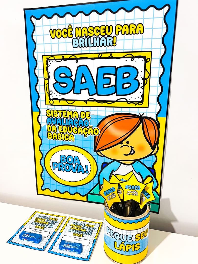 Kit de paineis e lembrancinhas sobr eo SAEB 2025 O arquivo é composto por um painel em PDF sobre o SAEB com 24 folhas ou 12 folhas; Marca Páginas sobre o SAEB; Cartazes sobre: O que é o Saeb? O que é o Ideb? Qual o objetivo do Saeb? Quem participa do Saeb? O que o Saeb avalia? Como o Saeb funciona? Qual a importância para a escola? Qual a importância para o aluno? Onde posso encontrar os resultados do SAEB? Plaquinhas para foto, com frases motivacionais sobre o Saeb; Cartão individual com 28 frases sobre o Saeb; Cartões para professores, família e alunos. Todos os arquivos são em PDF.