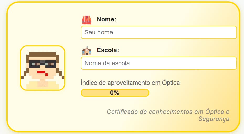 Simulador com quiz sobre Óptica e Segurança, foto IA em pixel art e geração de cartão-certificado com índice de acertos.