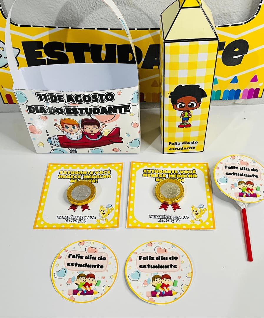 🎓✨ Lembrancinhas Dia do Estudante com moldura Com esse kit especial, você vai transformar a data em um momento inesquecível! 💛 ✅ Sacolinha personalizada ✅ Caixa lápis ✅ Cartão Medalha de ouro ✅ TAG para pirulito ✅ Tudo pronto para imprimir e montar com muito carinho! 💡 Ideal para presentear seus pequenos grandes alunos com criatividade e afeto!