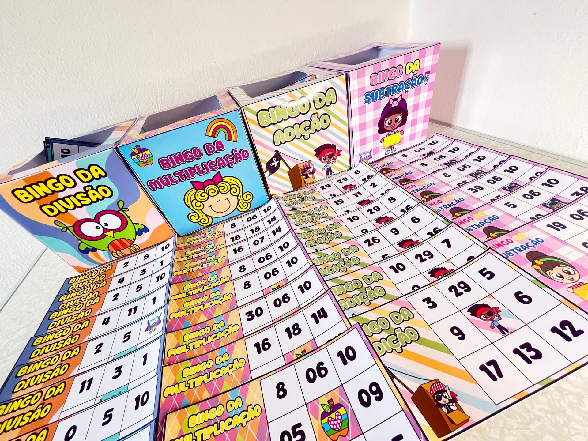 🎲 Combo Bingo das 4 Operações 🎲 Aprenda matemática de forma divertida com o Bingo da Adição, Subtração, Multiplicação e Divisão! Perfeito para crianças e adultos que querem praticar cálculos de um jeito leve e descontraído. 🧮✨