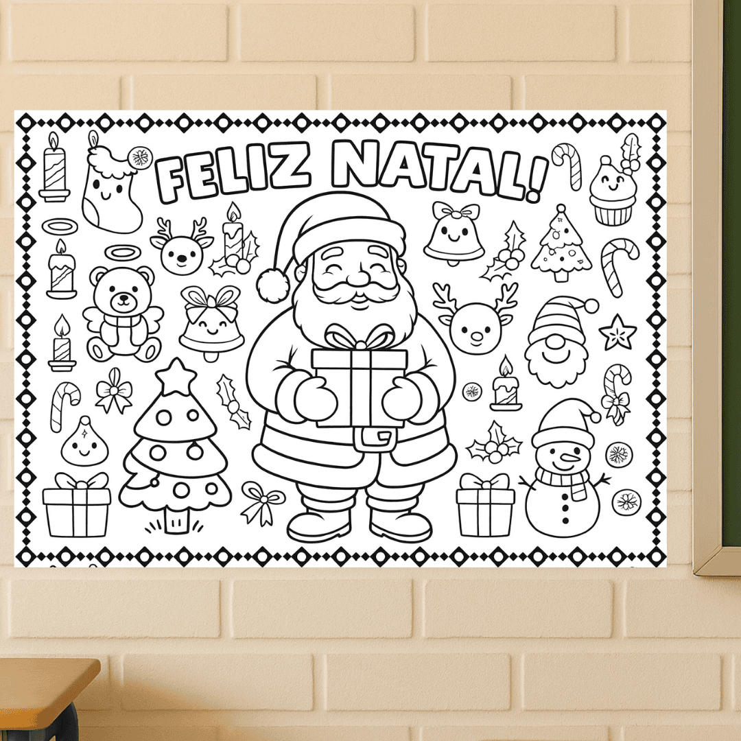 Celebre o clima natalino com o painel para colorir "Feliz Natal". Com ilustrações grandes, lúdicas e super fofas, as crianças podem pintar livremente, explorar a criatividade e entrar no clima de Natal de forma divertida e pedagógica.🎁👧🧒
