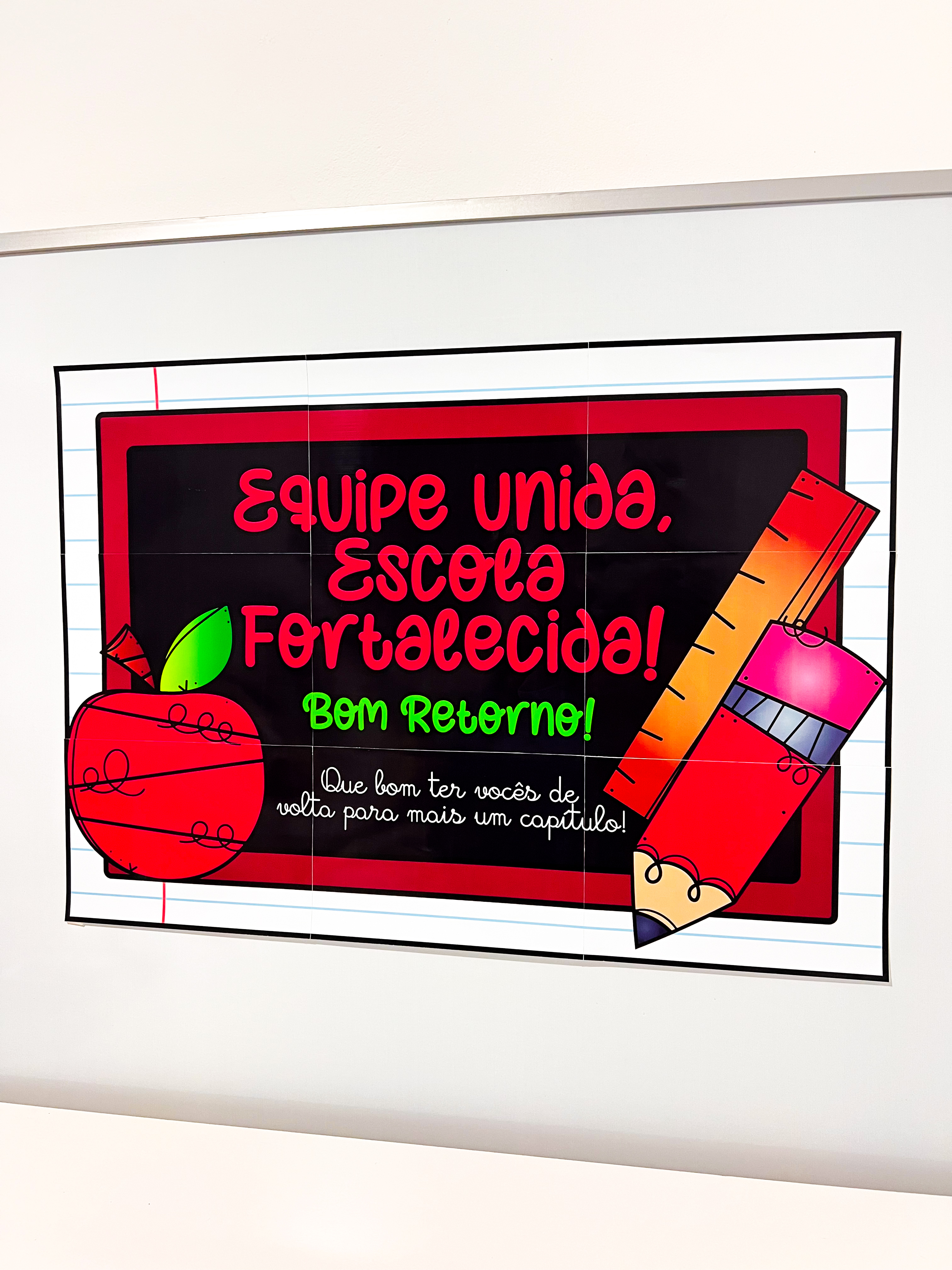 Esse material pedagógico é um painel de boas-vindas chamado "Painel Retorno da Equipe", composto por 9 folhas A4 que, juntas, formam uma mensagem acolhedora e motivacional para o início do semestre.