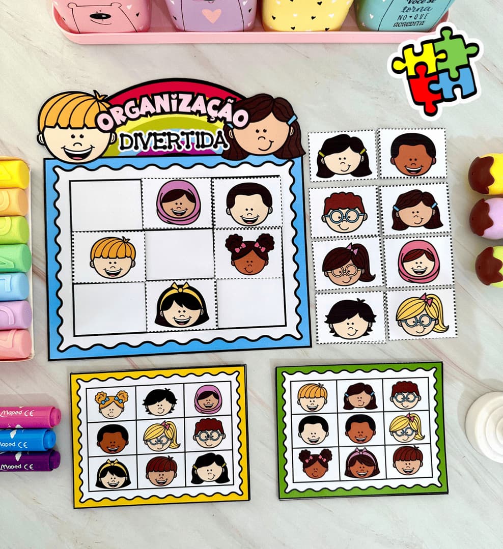 O arquivo 'Organização Divertida' é um recurso pedagógico projetado para desenvolver habilidades de organização de maneira lúdica e interativa com crianças da Educação Especial. O material vai em PDF pronto para impressão, e inclui 16 fichas. Utilizando fichas com desenhos de carinhas de crianças, este material ajuda a criar um ambiente de aprendizado envolvente, estimulando a capacidade de classificação, sequência e organização de informações de forma divertida e adaptada às necessidades individuais de cada aluno." Objetivos da proposta: Desenvolvimento da Habilidade de Organização Estimulação da Atenção e Concentração Aprimoramento da Memória Visual e Sequencial Promoção da Coordenação Motora Fina Aprendizagem Lúdica e Engajante Inclusão e Acessibilidade Desenvolvimento da Autonomia e Confiança Facilitação da Interação Social e Comunicação Estímulo ao Pensamento Lógico e Criativo