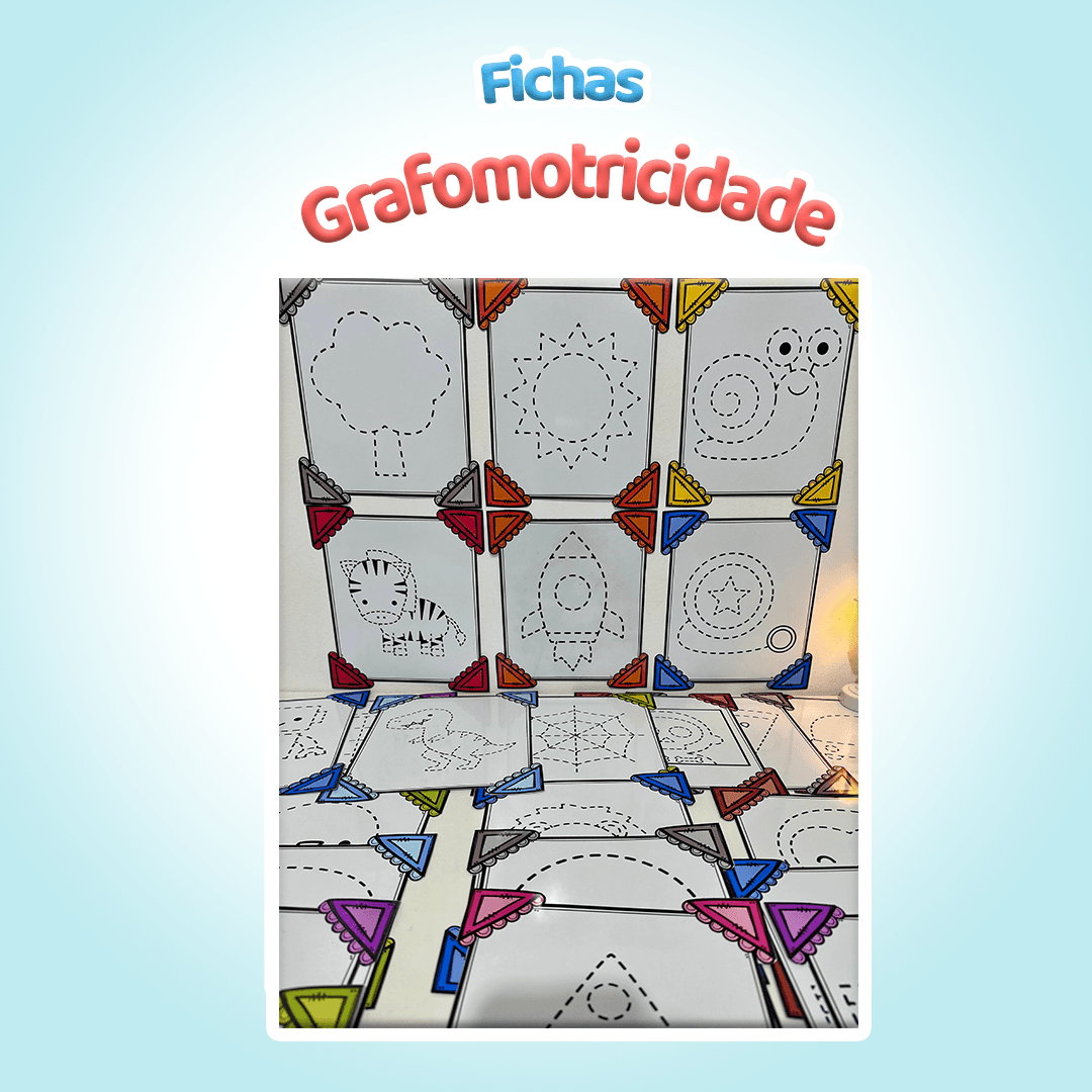 Fichas de Grafomotricidade com 30 atividades para desenvolver coordenação motora fina na Educação Infantil. Desenhos variados para cobrir o traçado. PDF pronto para imprimir. Não editável.