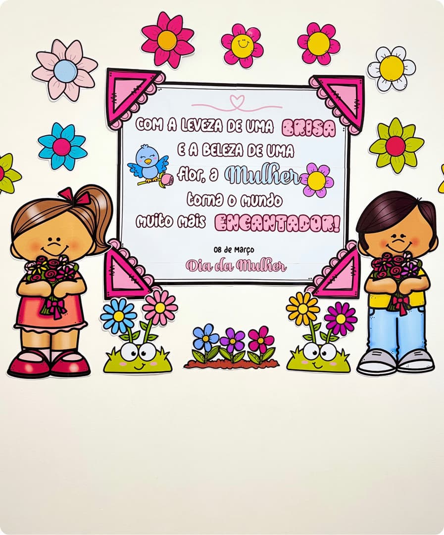 Painel Dia da Mulher Painel e Lembrancinha Dia da Mulher para turmas da Educação Infantil e séries iniciais do Ensino Fundamental. O material já vai ampliado e pronto para impressão. Medidas do painel montado: 1m de altura x 1,4m de largura. Painel Dia da Mulher PDF, não editável.
