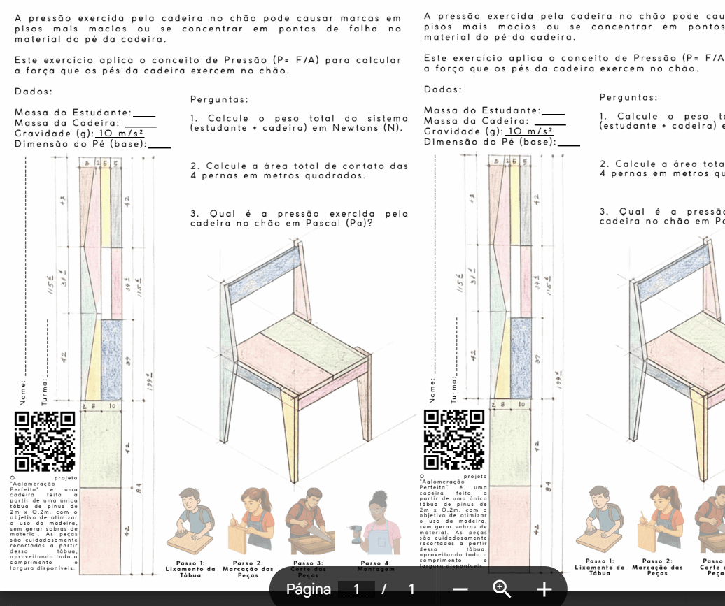 Atividade interdisciplinar que relaciona Física e Marcenaria usando o projeto da cadeira “Aglomeração Perfeita”. Os alunos calculam força, área de contato e pressão exercida no chão. Inclui instruções e espaço para nome e turma.