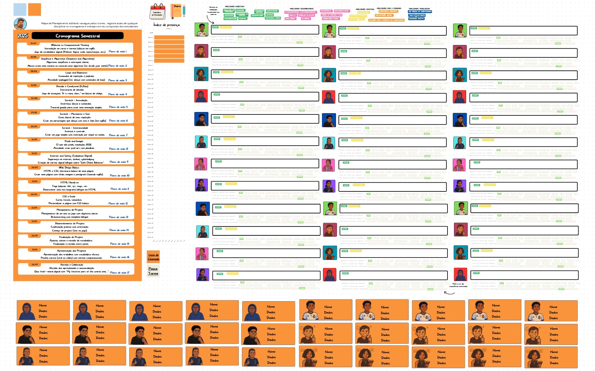 Cronograma semestral interativo para planejar, registrar e acompanhar aulas com foco em habilidades e conquistas dos estudantes.