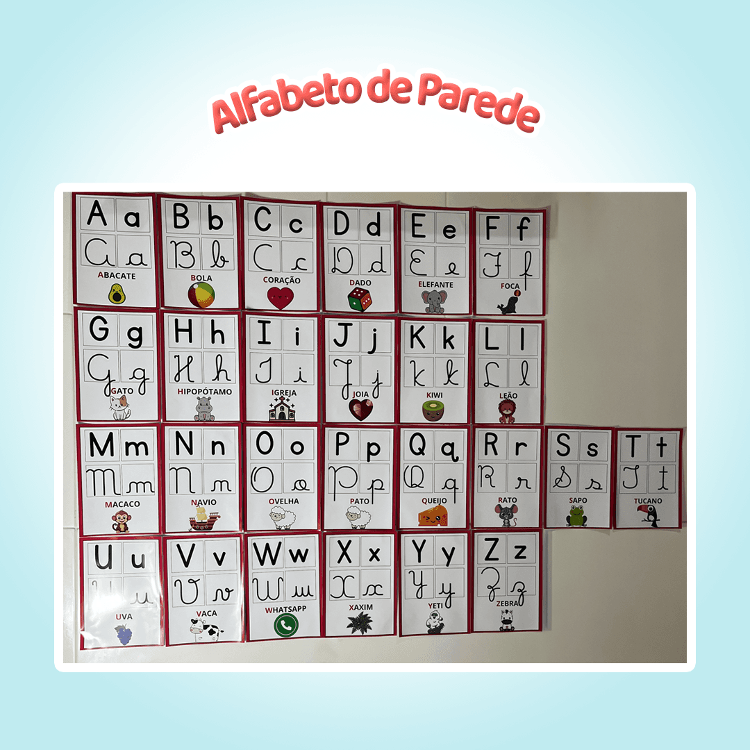 Alfabeto de parede lindo e educativo, com letras nos quatro tipos, palavras ilustradas e apoio visual ideal para a alfabetização.