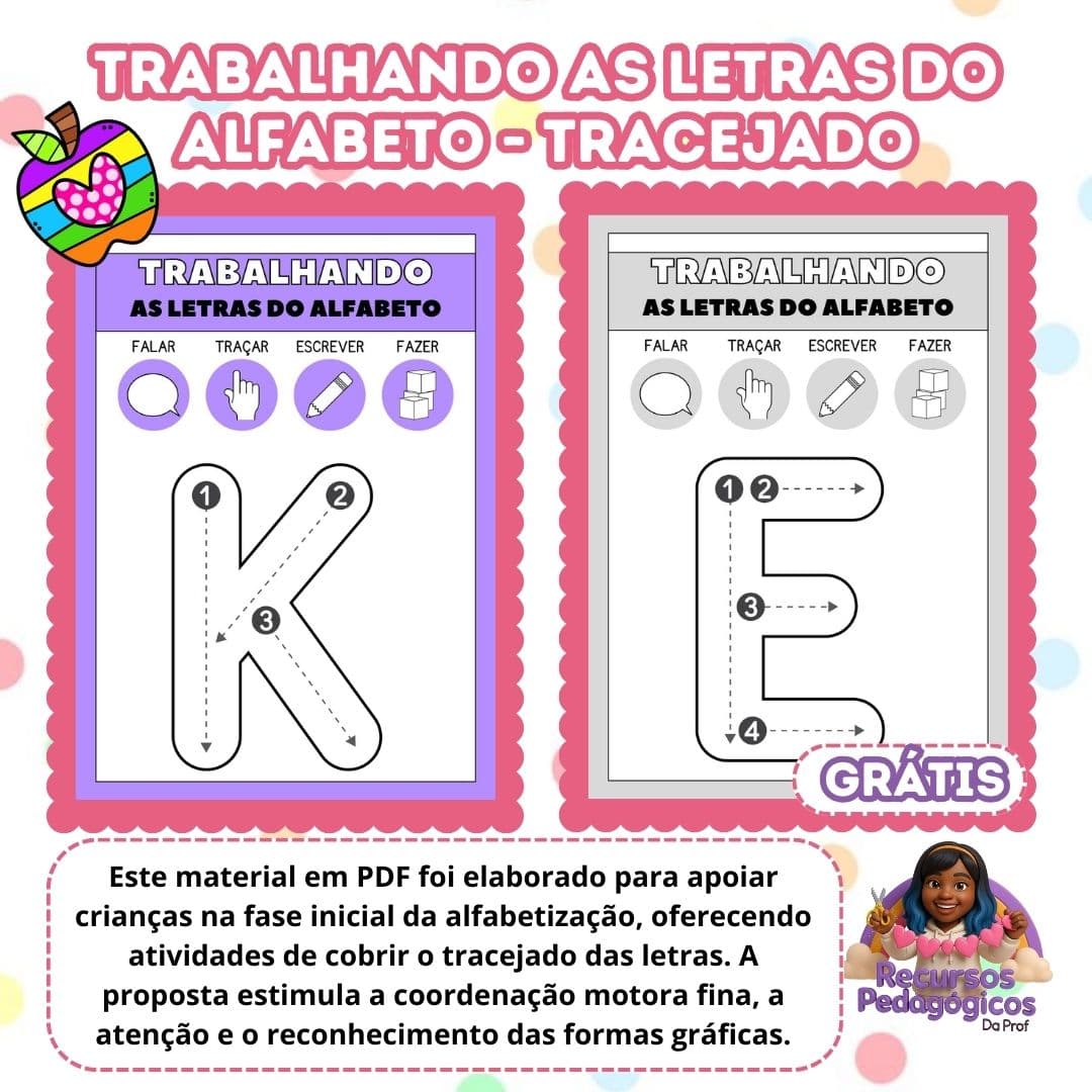 📝 Este material em PDF foi elaborado para apoiar crianças na fase inicial da alfabetização, oferecendo atividades de cobrir o tracejado das letras. ✍️ A proposta estimula a coordenação motora fina, a atenção e o reconhecimento das formas gráficas.