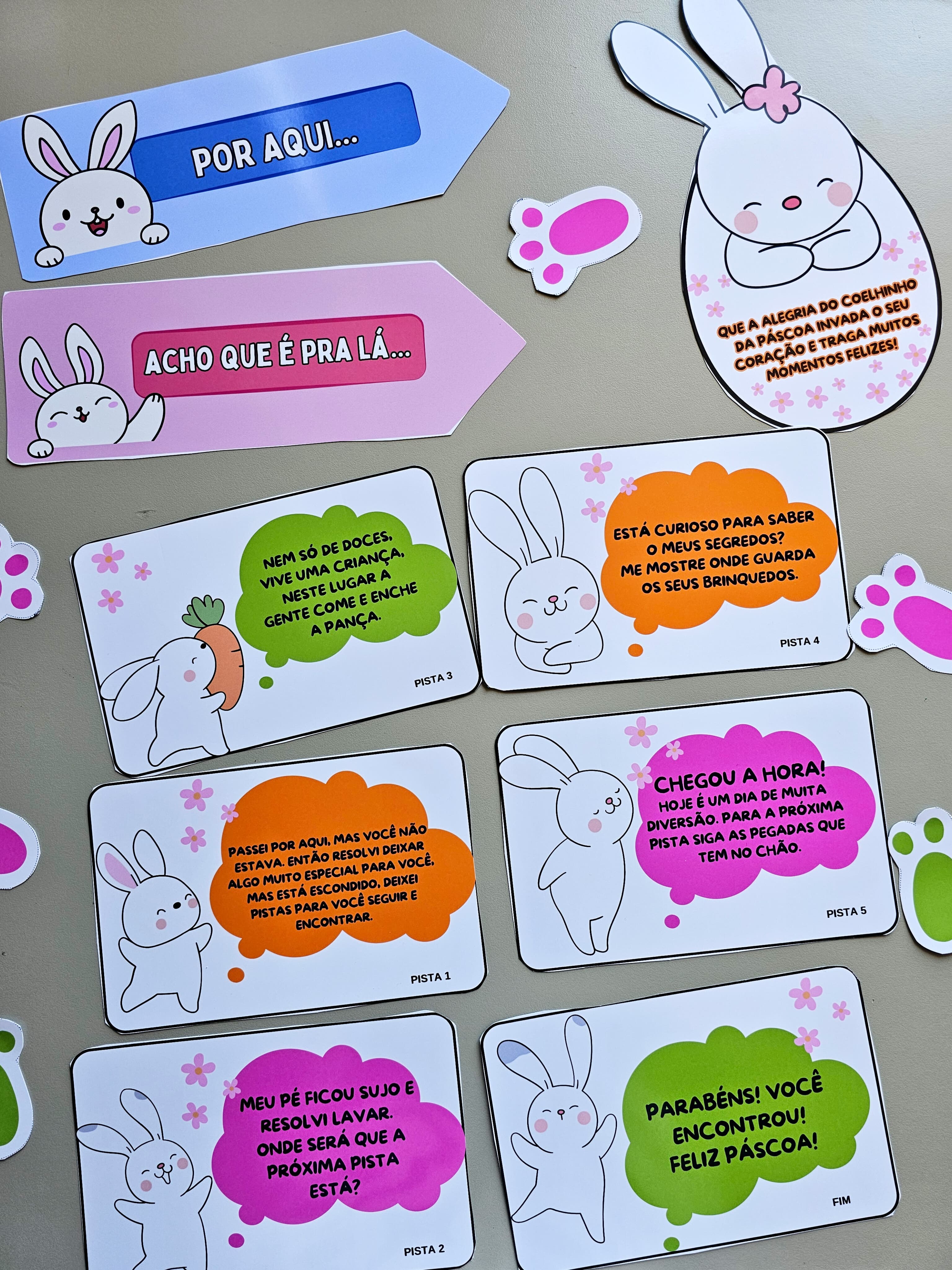O arquivo inclui pistas prontas e pegadas do coelhinho para montar uma experiência mágica com as crianças.