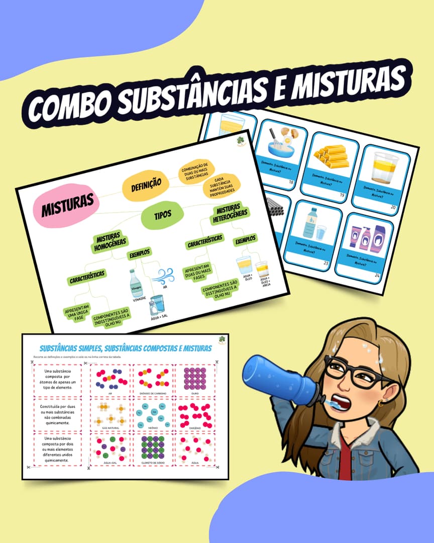 Esse combo é um material educacional sobre substâncias e misturas, com atividades lúdicas e teóricas para o Ensino Fundamental, que facilita o aprendizado de substâncias puras simples e compostas e misturas homogêneas e heterogêneas.