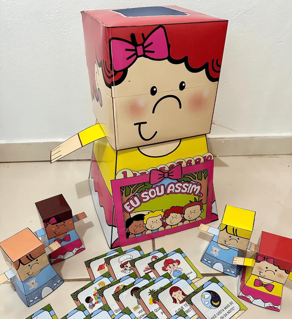 Kit de contação de história e dinâmica de apresentação para primeiro dia de aula. Essa proposta trabalha identidade e respeito às diferenças, e também é uma excelente oportunidade para as crianças se apresentarem para os colegas e para a professora. O arquivo vai em PDF pronto para impressão. Inclui vídeo tutorial para montagem dos materiais. O kit inclui: Boneca gigante (43 cm de altura e 28 cm de largura) História interativa Fichas para dinâmica de apresentação Personagens 3D (12 cm de altura e 7 cm de largura)