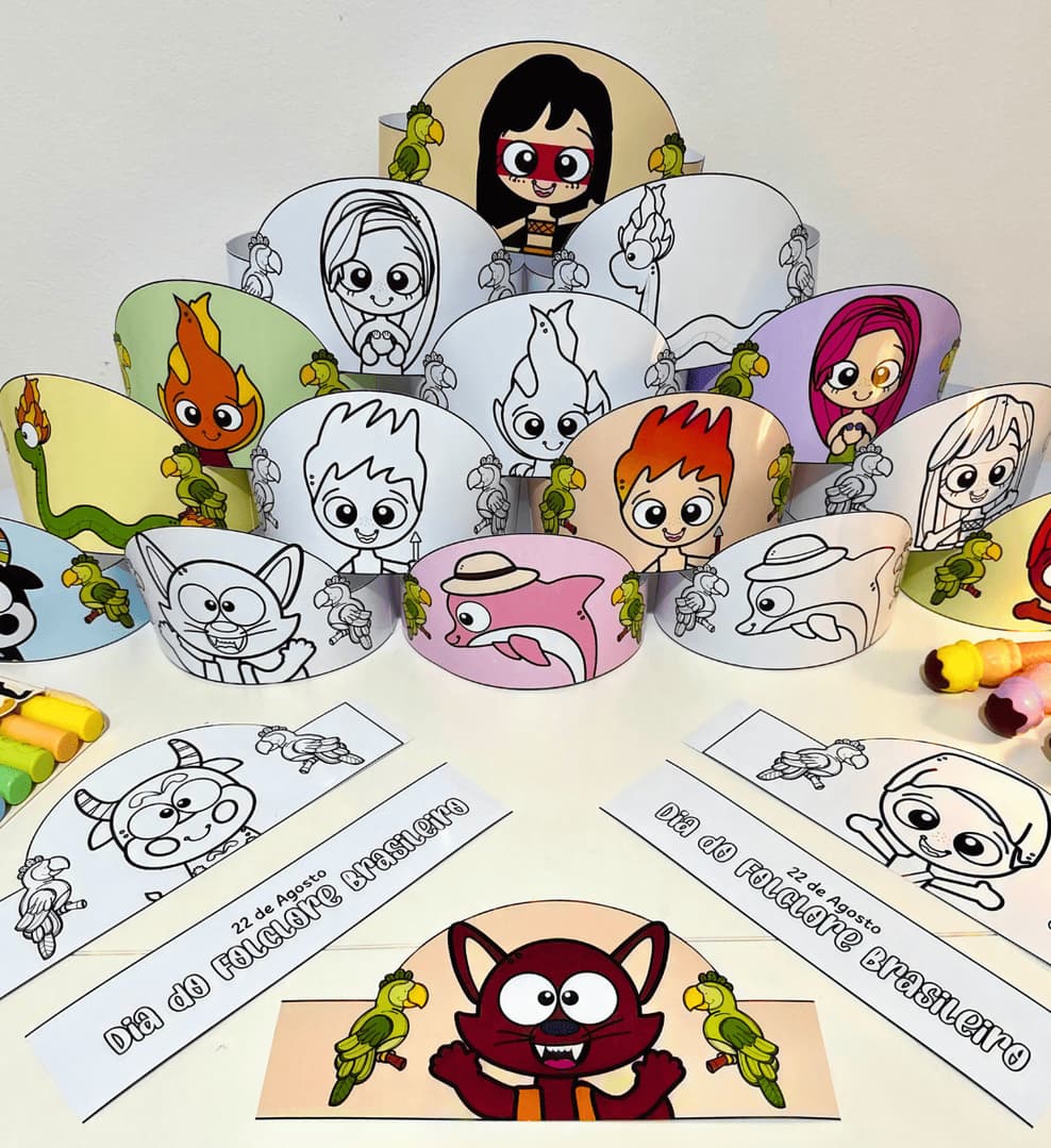 Coroas Lendas do Folclore para trabalhar o tema com crianças da Educação Infantil. Vai com 9 coroas coloridas e 9 coroas para colorir, e inclui os personagens das principais lendas do Folclore Brasileiro. O material vai em PDF pronto para impressão. Não editável.