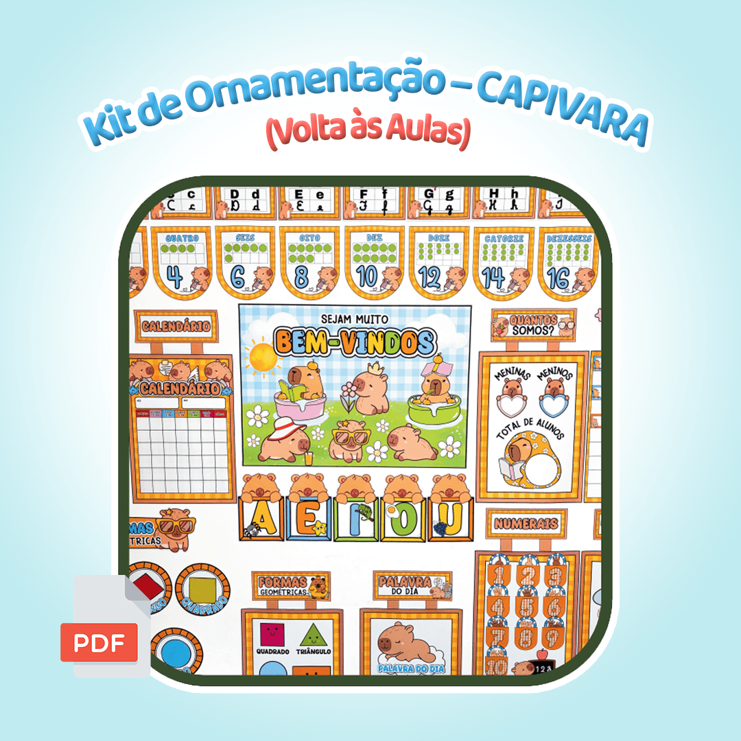 Kit de Ornamentação CAPIVARA para deixar a sala de aula acolhedora e divertida! Contém alfabeto, numerais, calendário, rotina, combinados, chamadinha editável, painéis e +50 elementos A4. PDF pronto para imprimir.