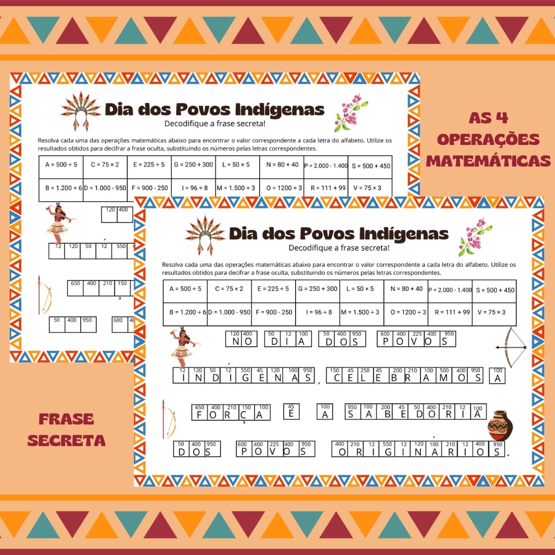 Decifre a Frase Secreta do Dia dos Povos Indígenas! 🧩✨ Uma atividade lúdica que combina matemática e conscientização cultural! Inclui gabarito e mensagem inspiradora.