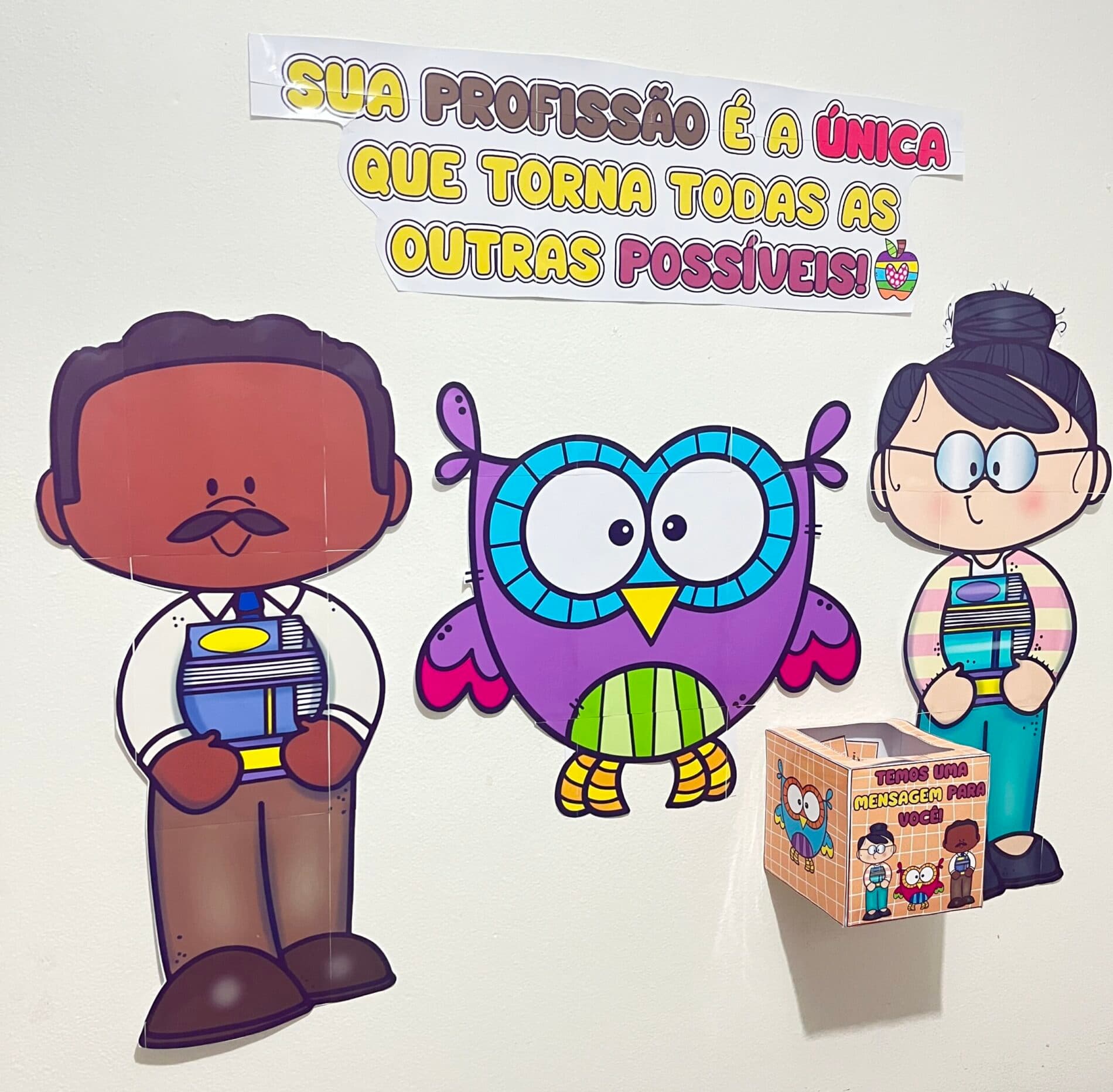 Frase: "Sua profissão é a única que torna todas as outras possíveis." Inclui lindos elementos para compor o painel e uma caixa com 30 frases para incentivar o dia a dia do professor. Dimensões: - Largura: 1,10 m - Altura: 1,05 m