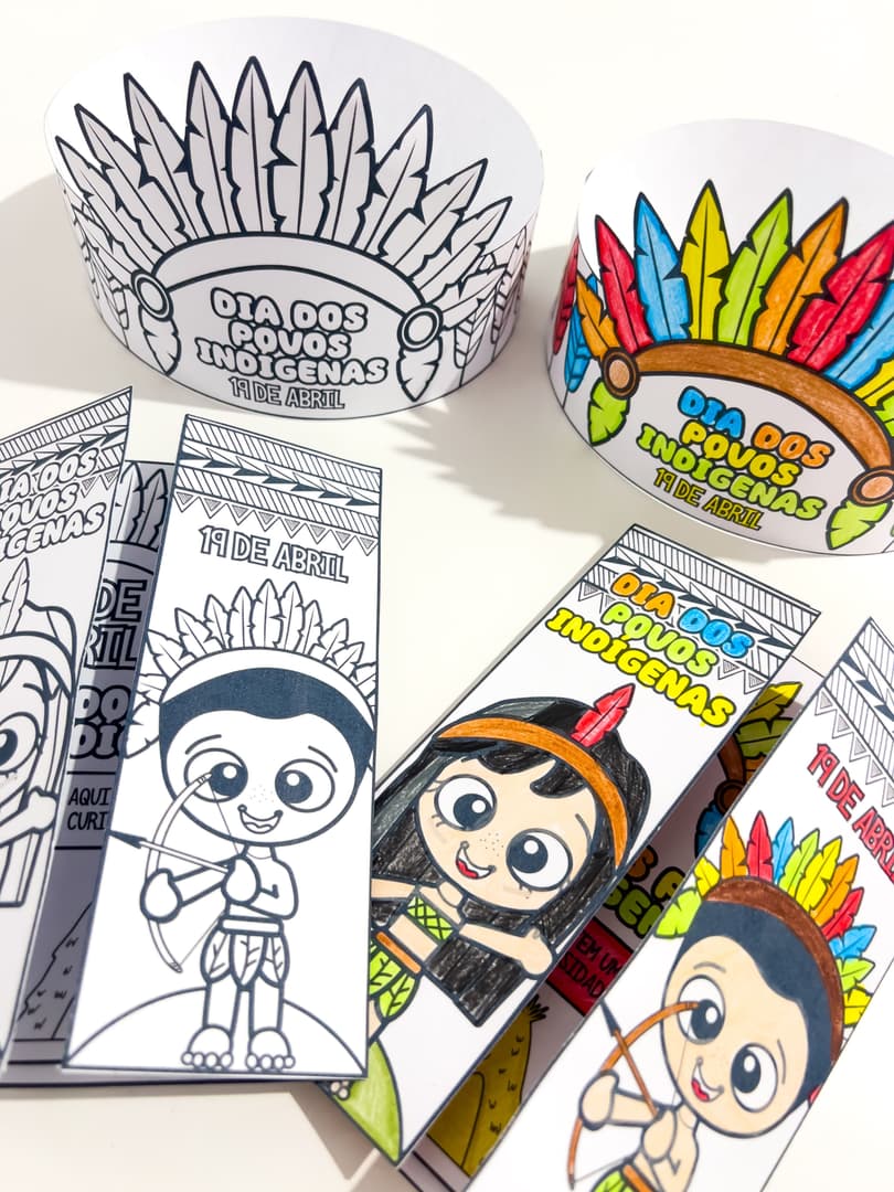 Atividade Interativa Dia dos Povos Indígenas – Lapbook + Coroa Este lapbook interativo sobre o Dia dos Povos Indígenas apresenta, de forma clara e acessível, a história, a cultura e a importância dos povos indígenas no Brasil. Através de abas, rodas giratórias e cartões interativos, seus alunos poderão explorar tradições, personagens históricos e curiosidades de maneira lúdica e envolvente. – O material também contém um modelo de coroa. – O lapbook e a coroa são para colorir, o da imagem exemplar está colorido com lápis de cor. Atividade Interativa Dia dos Povos Indígenas pronta para impressão.