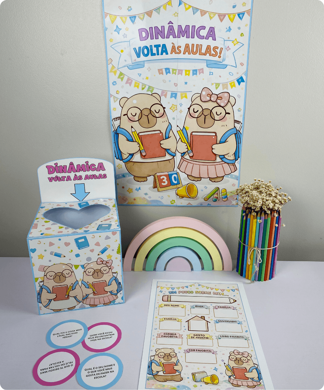 Dinâmica Volta às Aulas Tema Capivara Essa dinâmica volta às aulas no tema capivara foi criada especialmente para ajudar as crianças a se apresentarem, expressarem sentimentos e criarem vínculos logo no início do ano letivo.