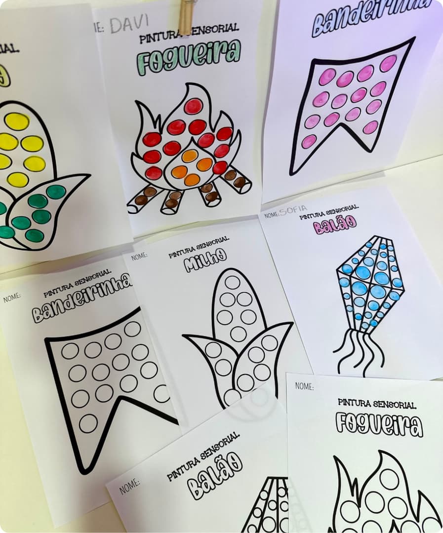 Atividades Pintura Sensorial – Festa Junina Atividades pintura sensorial para trabalhar o tema Festa Junina com turmas da Educação Infantil. O material vai na opção para colorir, e na proposta as crianças podem realizar pinturas com tinta guache utilizando o dedo para preencher os espaços. O material vai em PDF pronto para impressão. Não editável.