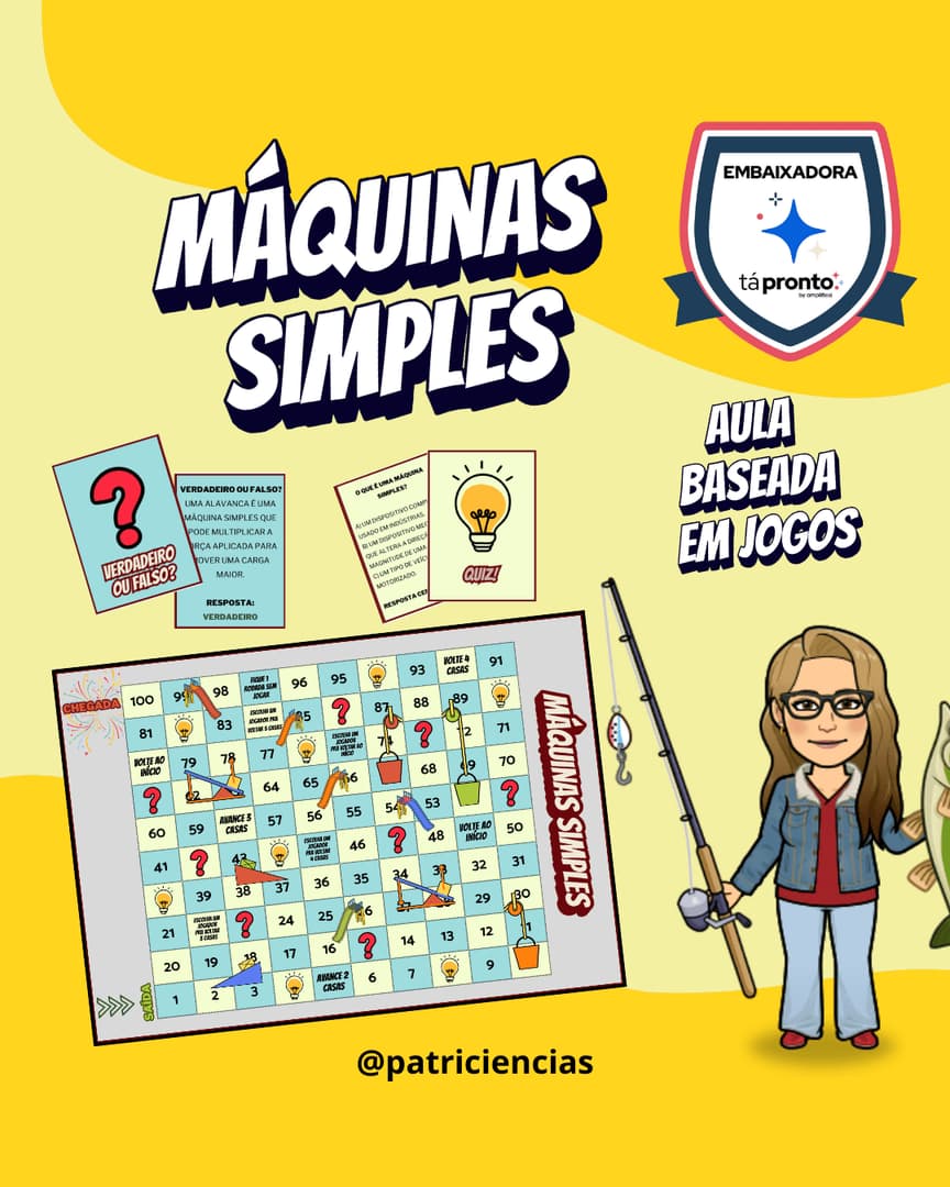 O "Jogo de Tabuleiro - Máquinas Simples" ensina conceitos de máquinas simples de forma lúdica, ideal para aulas e atividades educacionais, sendo uma ferramenta educativa divertida para ensinar e aprender sobre máquinas simples.