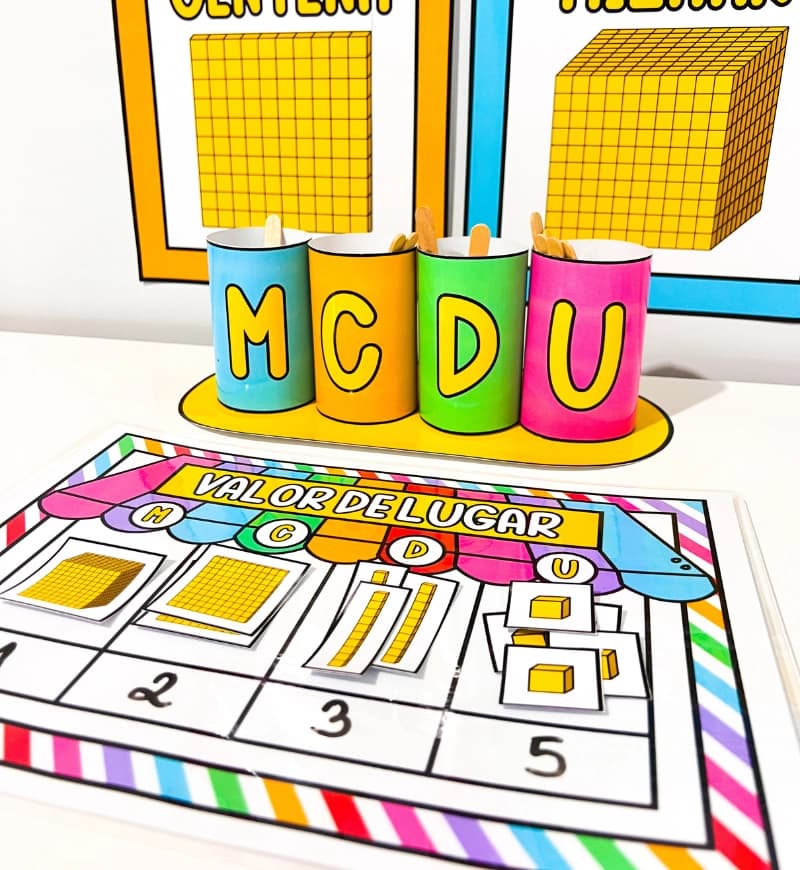 Esse material pedagógico colorido e interativo é ideal para trabalhar o sistema de numeração decimal com os alunos dos anos iniciais. O Kit Recursos de Material Dourado contém painéis ilustrativos com os blocos de unidade, dezena, centena e milhar, todos organizados com um recurso visual que chama a atenção das crianças e facilita a compreensão do valor posicional dos números. O arquivo vai em PDF pronto para impressão. O kit acompanha: Painel com divisões visuais para unidade, dezena, centena e milhar; Cartazes com representações dos blocos dourados; Jogo da memória com cartões para leitura, comparação e construção de números; Fichas para escolher a opção correta que corresponde as peças da imagem; Quadro de valor de lugar com fichas móveis; Potinhos organizadores com as letras M, C, D e U para atividades práticas com palito de picolé; Peças com imagens de blocos dourados e números para associação.