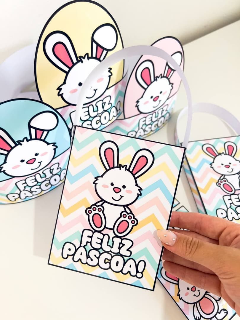 Lembrancinhas de Páscoa – Coelho Este é um combo de lembrancinhas de Páscoa para que o professor possa presentear seus alunos em comemoração à Páscoa na escola. São lindos modelos em tons pastéis com a temática do coelhinho. Não vai modelo para colorir. Encante seus alunos com essas lindas lembrancinhas de Páscoa no tema coelho e comemore essa data de forma lúdica e criativa. Nesse kit contém: 3 cores de coroa Cartãozinho Sacolinha