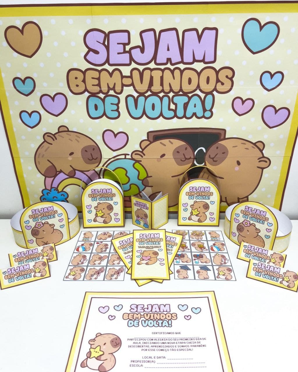Encante seus alunos no retorno às aulas! O Kit Volta às Aulas Capivara Fofa traz atividades, lembrancinhas e decoração para um primeiro dia acolhedor, divertido e cheio de carinho.