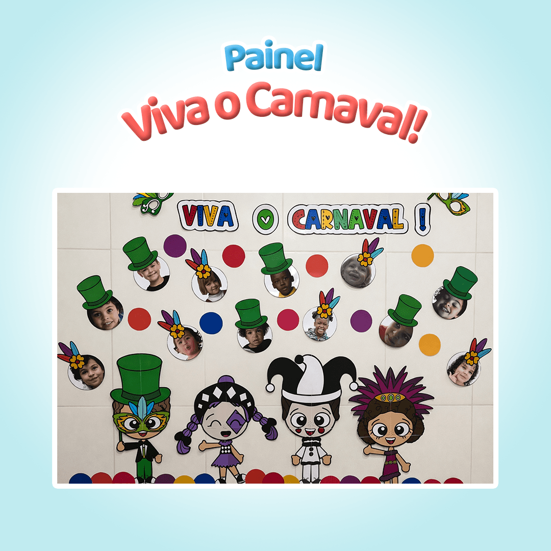 Painel temático de Carnaval em PDF para imprimir, com 4 personagens, máscaras de brinde e link editável para adicionar fotos dos alunos. Ideal para decorar a sala e registrar momentos especiais.