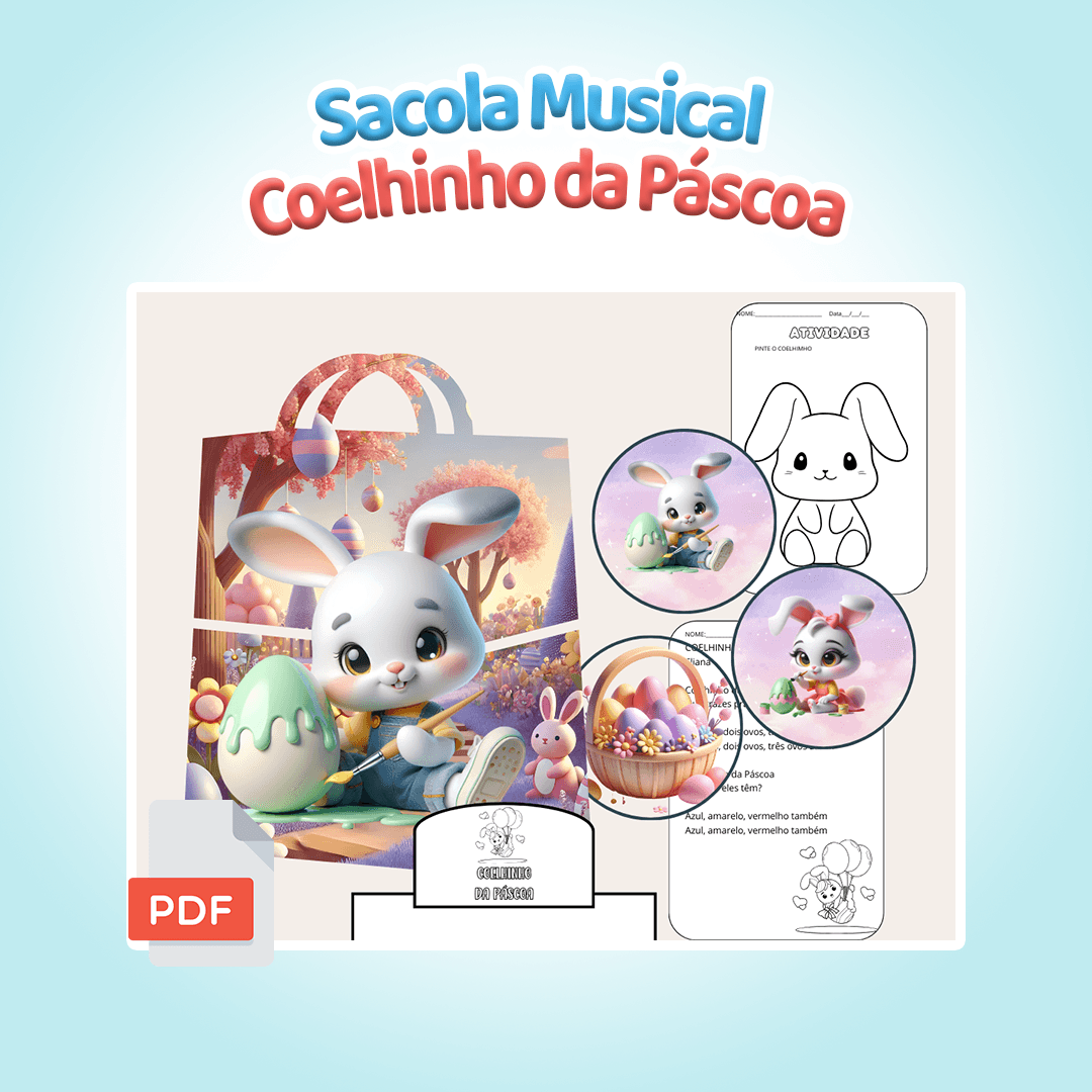 Material lúdico para trabalhar a música Coelhinho da Páscoa com as crianças. Inclui sacola personalizada, cards ilustrados, letra da música e atividades criativas. Arquivo em PDF pronto para imprimir.