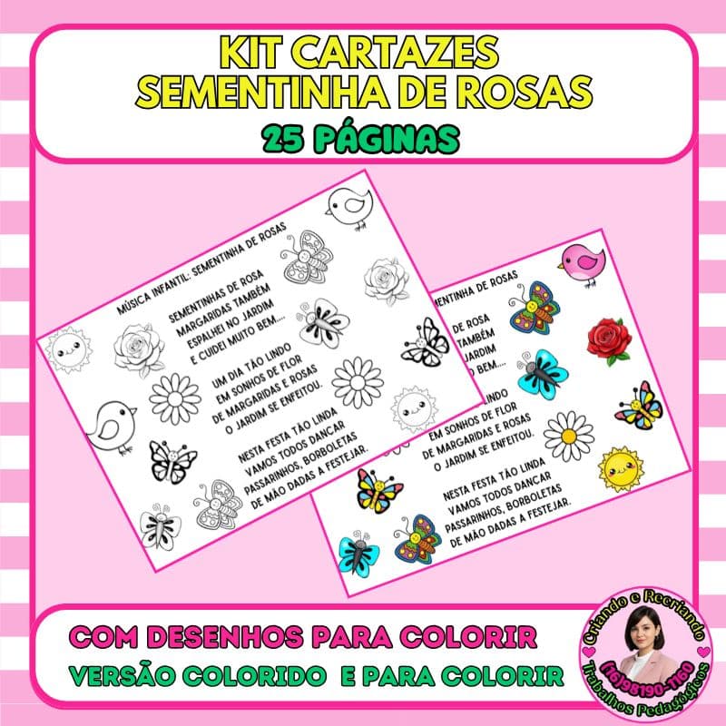 Kit com 2 cartazes da música Sementinha de Rosas: um colorido e um para colorir. Arquivo ampliado, com 25 páginas cada, perfeito para mural, apresentações e atividades de musicalização.